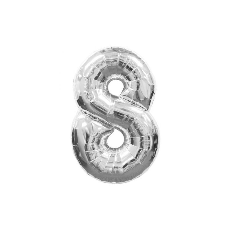 Spectaculaire ballon métallique argenté en forme de chiffre 8. Une option originale et frappante pour surprendre quelqu'un lors de son anniversaire. Possibilité de le gonfler avec air ou hélium, contient une petite vanne pour empêcher la fuite. Article de haute qualité et durabilité.
