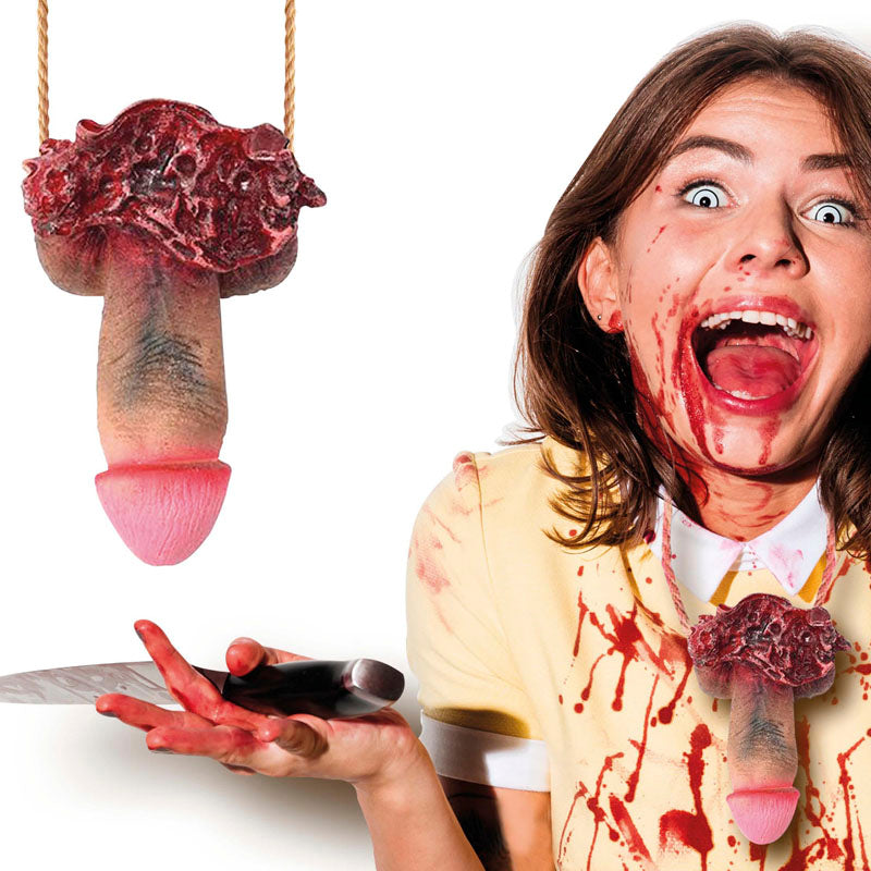 Collier avec membre viril amputé est la touche terreur parfaite pour compléter votre costume Halloween de manière frappante et colorée lors de tout événement déguisé ou soirée costumée horrifiante.