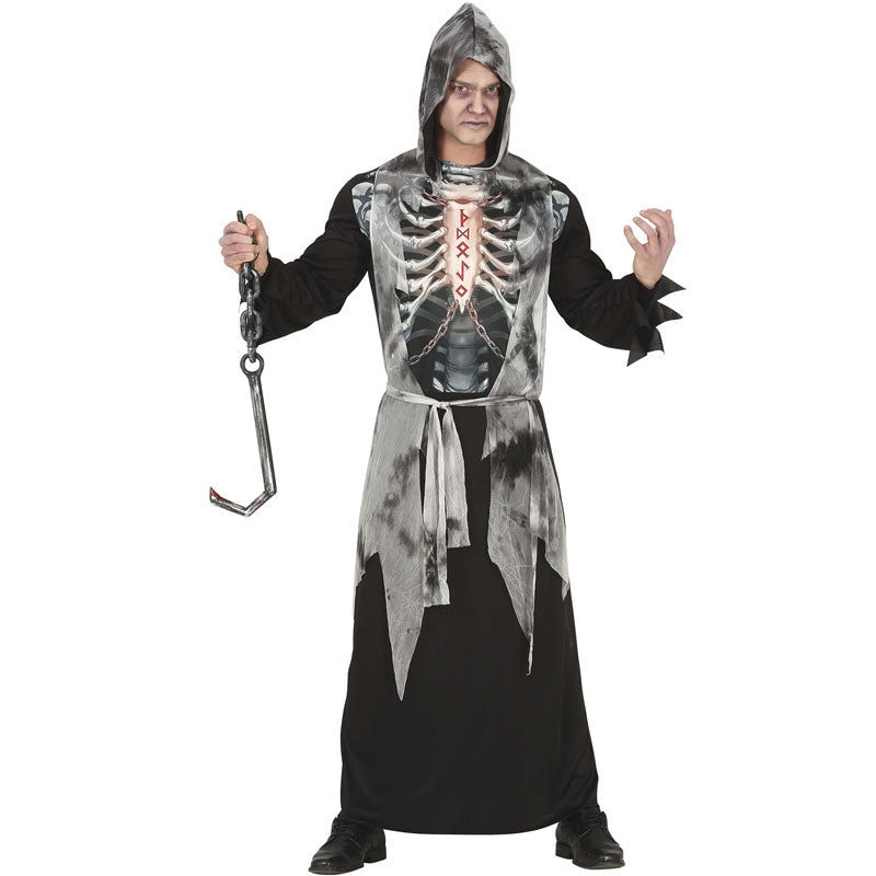 Le costume Halloween Squelette en haillons pour hommes contient : Tunique à capuche | Cette tenue horrifique adulte imitant un Squelette est disponible en taille unique