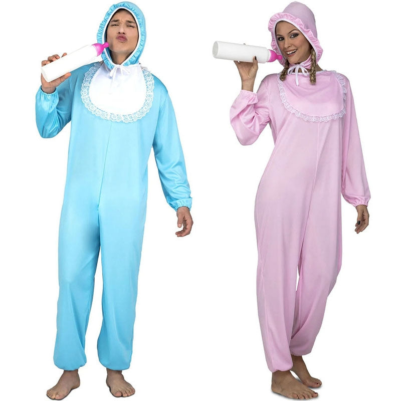 Le costume taille adulte Bébé couleur bleu pour hommes contient: combinaison, bavoir et coiffe et le costume taille adulte Bébé couleur rose pour femmes contient: combinaison, bavoir et coiffe.