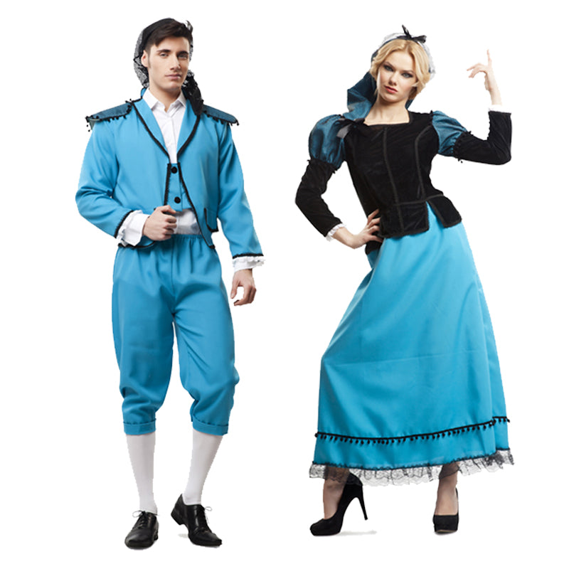 Le costume pour homme Belle Époque de style Goya contient: Veste, pantalon et coiffe et le costume pour femme Belle Époque de style Goya contient: Robe et coiffe.