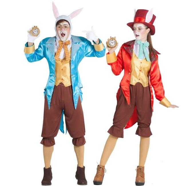 Le costume adulte imitant le Lapin d’Alice au Pays des merveilles pour hommes contient: chapeau avec oreilles, veste, pantalon et gilet avec chemise et nœud de papillon et le costume adulte imitant le Lapin d’Alice au Pays des merveilles pour femmes contient: chapeau avec oreilles, veste, pantalon et gilet avec chemise et nœud de papillon.