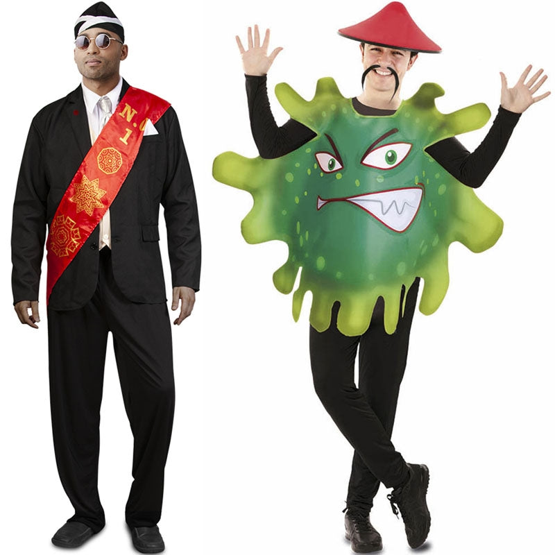 Le déguisement Porteur de Cercueil contient: chapeau, écharpe, cravate, veste avec fausse chemise et pantalon et le costume Coronavirus pour hommes et femmes contient: combinaison en forme de virus | Maillot NON inclus.