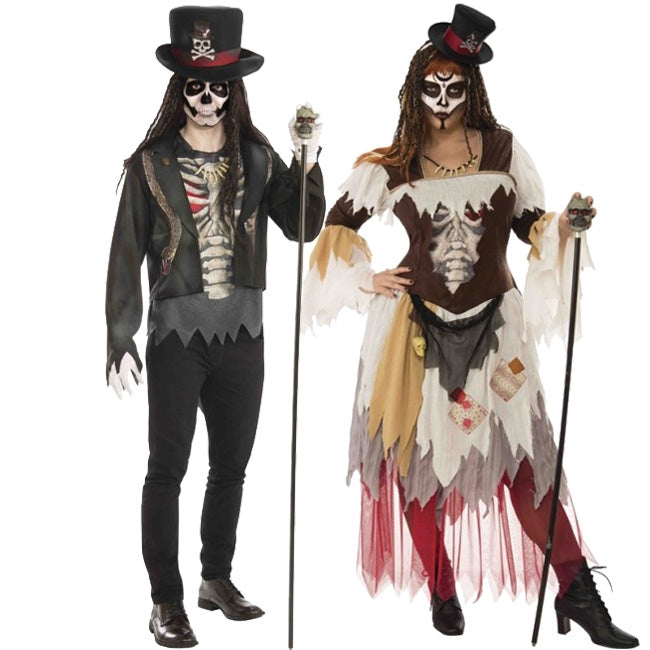 Le déguisement adulte Halloween imitant une poupée vaudou pour hommes contient: veste, chemise avec collier, chapeau et le costume adulte Halloween d’une poupée vaudou pour femmes contient : robe avec collier et chapeau.
