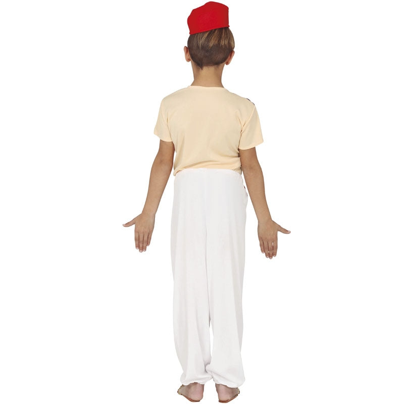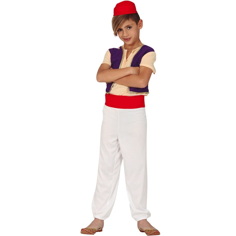 Le costume original Aladdin errant pour garçons contient : coiffe, chemise avec gilet, pantalon et ceinture | Cette tenue garçon imitant Aladin ou la lampe merveilleuse est disponible en 3 tailles différentes