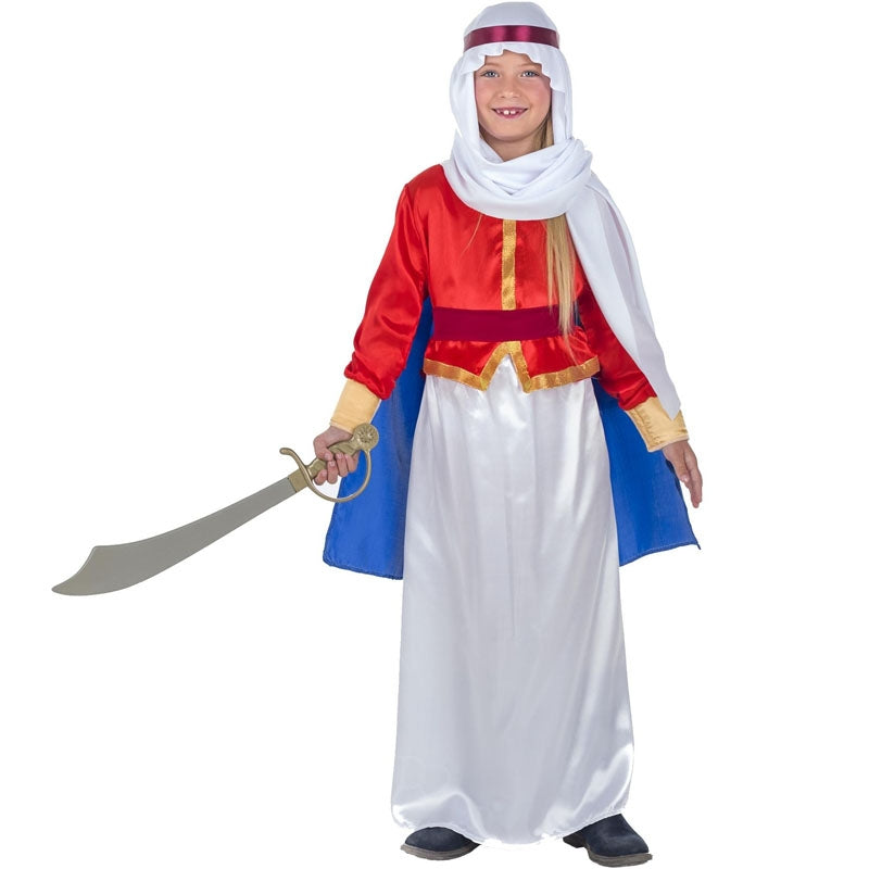 El disfraz infantil imitando una Árabe beduina para niñas incluye: Turbante, Cinta de la Cabeza, Capa, Blusa, Fajín y Falda | Este disfraz niña Árabe nómada está disponible en 4 tallas distintas