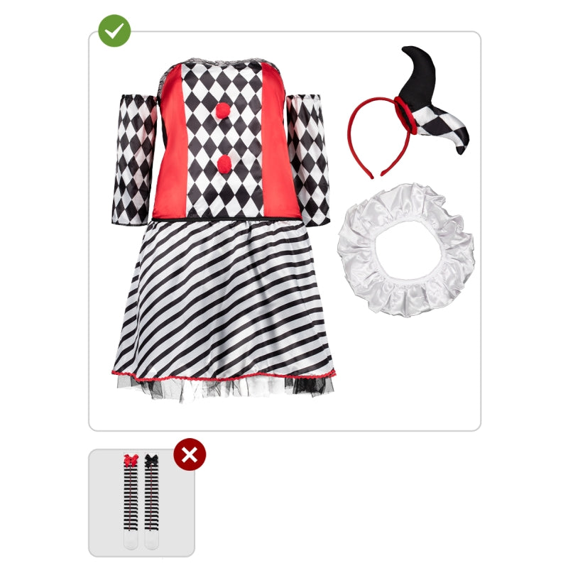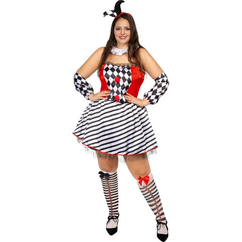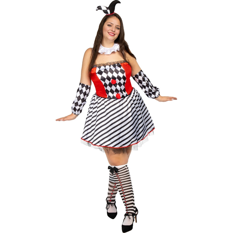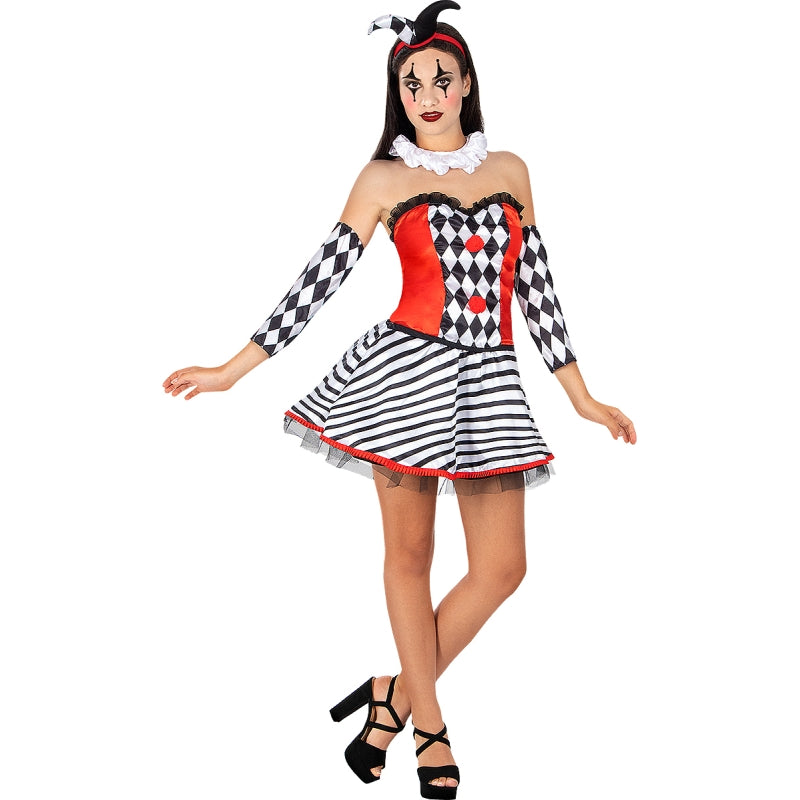 Ce costume exclusif de Arlequin Sexy pour femmes contient : Robe, poignets, col et serre-tête | Ce déguisement de femme pour se transformer en clown théâtral avec attitude séduisante est disponible en 6 tailles différentes