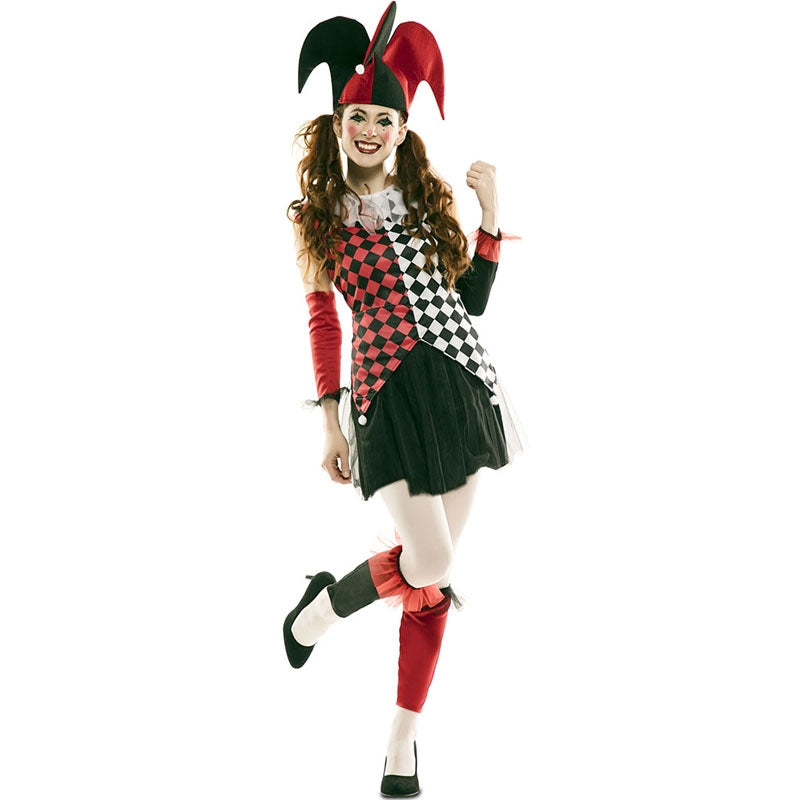 Le costume adulte imitant une tenue Arlequin Vénitienne pour femmes contient: robe, coiffe, bracelets et jambières | Ce déguisement femme bouffonne à losanges blancs, noirs et rouges est disponible en 3 tailles différentes