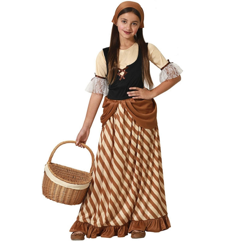 Le costume original Aubergiste médiéval brun pour filles comprenant : robe avec corsage et écharpe | Cette tenue fille imitant une aubergiste médiéval brun est disponible en 4 tailles différentes