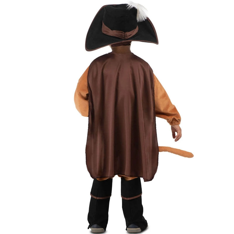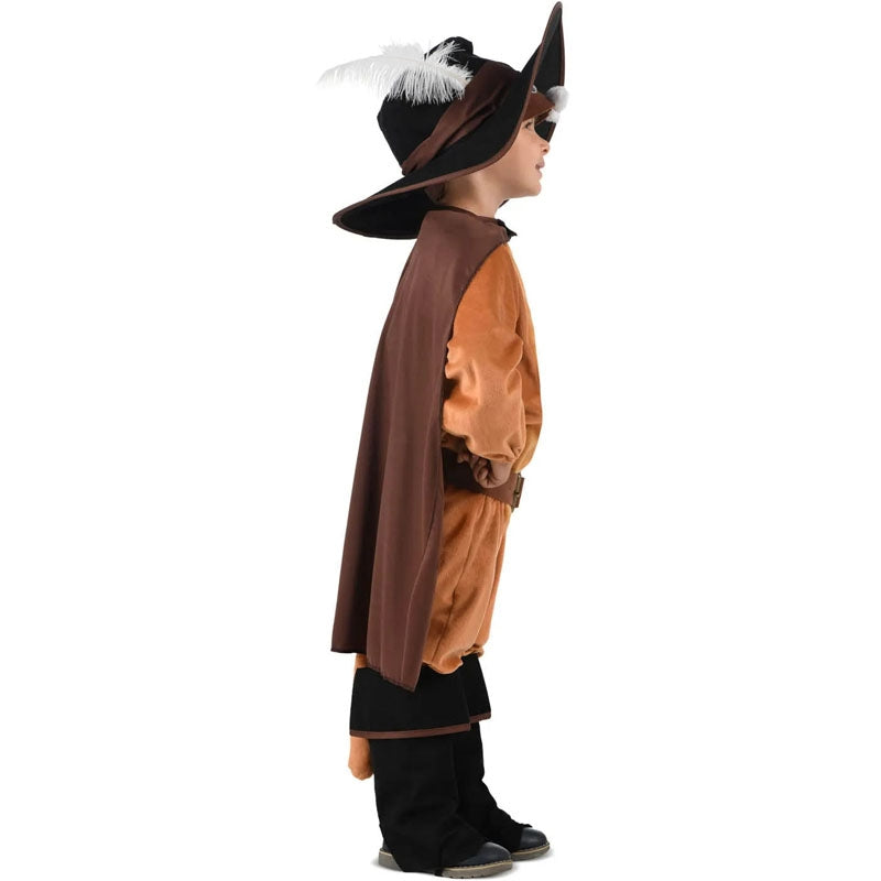 Le costume original les Aventures du Chat Botté pour garçons contient: Chapeau, masque, cape, combinaison, ceinture, queue et jambières. | Cette tenue garçon imitant un le Chat Botté du conte de Perrault est disponible en 4 tailles différentes