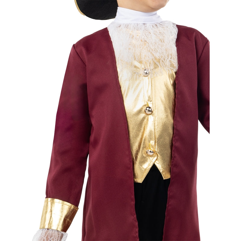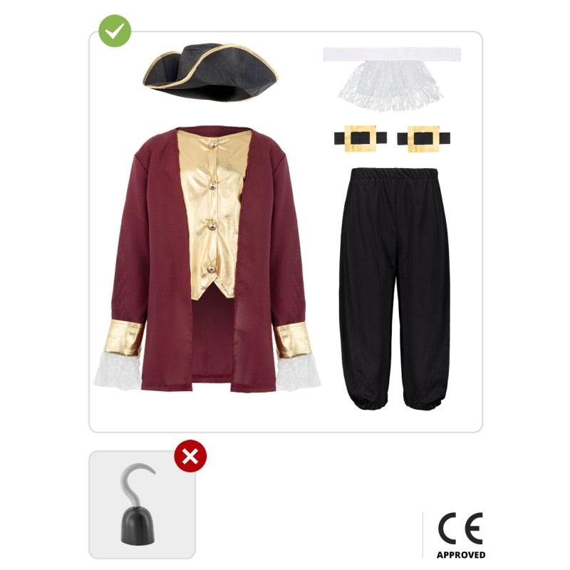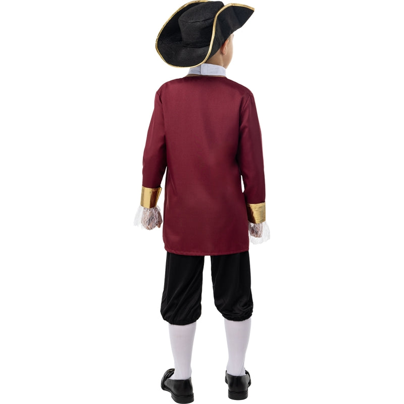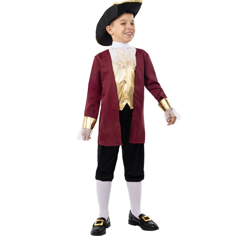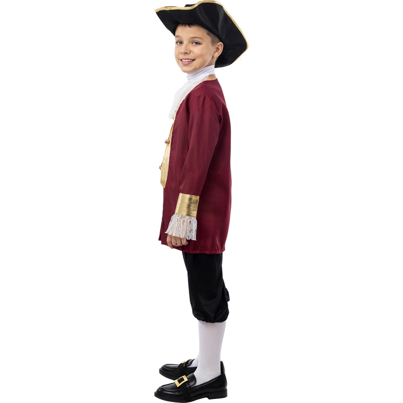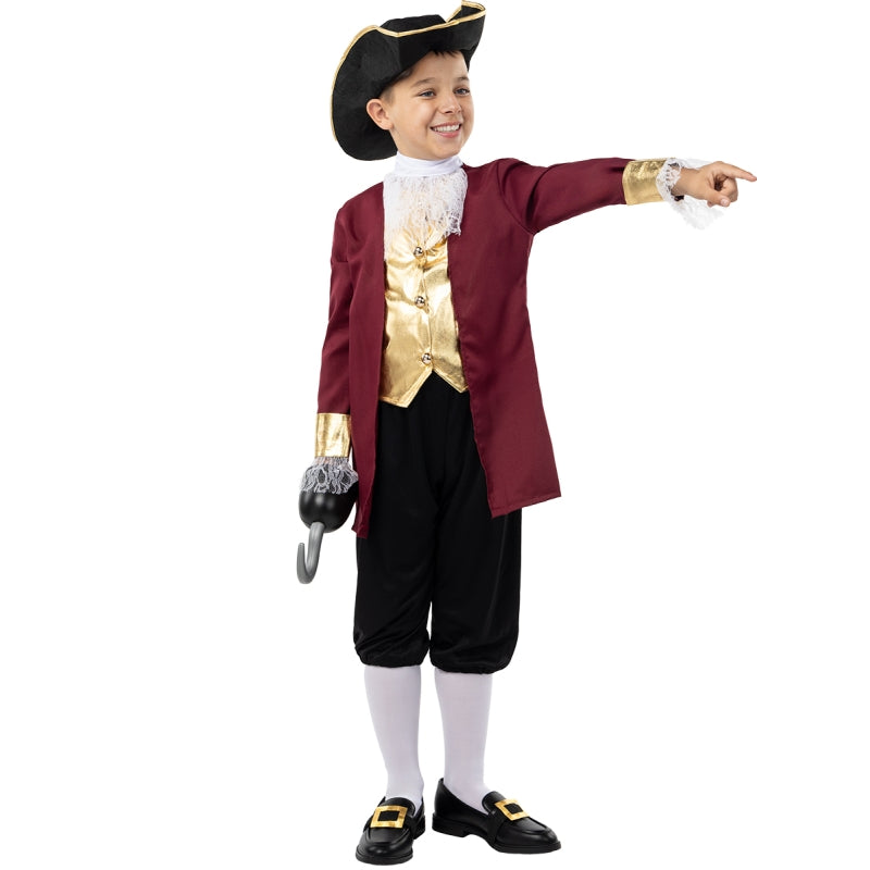 Le costume exclusif de Capitaine Crochet classique pour enfants comprend : Short, veste avec gilet, chapeau et boucles pour chaussures | Ce tenue d'enfant imitant Capitaine Crochet classique – Pirate est disponible en 4 tailles différentes.