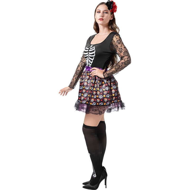 Imaginez-vous marcher dans la brume de la nuit d'Halloween, laissant votre empreinte à chaque pas comme la Catrina en dentelle la plus élégante de la fête. Votre robe combine le mystère du squelette avec la joie des couleurs mexicaines, vous enveloppant dans la magie et la tradition des déguisements d'Halloween pour femme. Vous n'êtes pas seulement une invitée, vous êtes l'essence même de l'inoubliable. Prête à séduire les regards et à voler des soupirs à la meilleure fête thématique ?