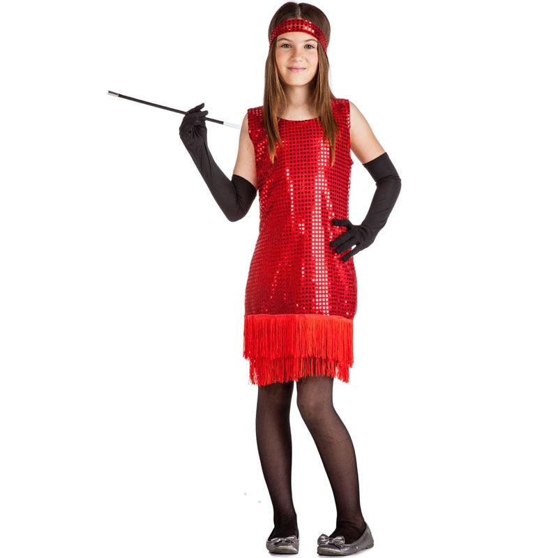 Le déguisement enfant imitant la tenue danseuse Charleston pailletée en couleur rouge pour filles contient: Robe et bandeau pour la tête | Le déguisement Danseuse Charleston fille est disponible en 4 tailles différentes