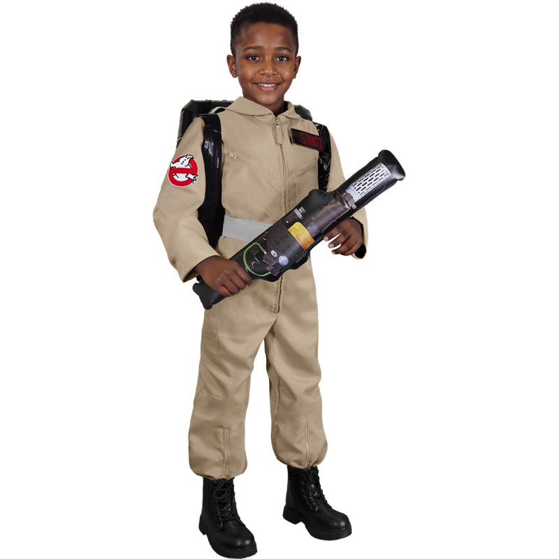 Costume officiel de Chasseurs de Fantômes pour enfants avec combinaison à 4 écussons et sac à dos avec pistolet gonflable. Disponible en 4 tailles. Parfait pour attraper les fantômes avec style.