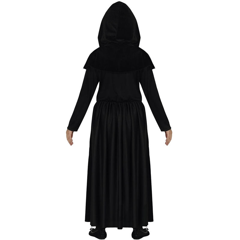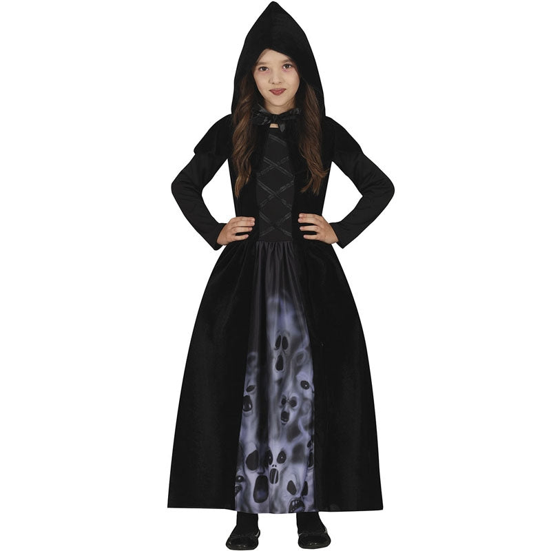 Le costume Halloween Chasseuse d'âmes pour filles contient: robe et demi-cuirasse à capuchon | Cette tenue effrayante fille imitant une voleuse d'âmes est disponible en 3 tailles différentes