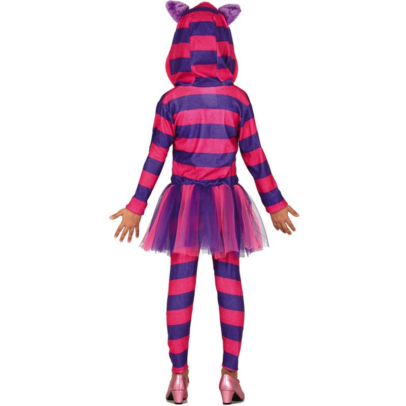 Le costume enfant imitant le Chat Cheshire du conte d’Alice au Pays des merveilles pour filles contient : chemise avec capuche et jupe tutu et pantalon | Ce déguisement fille Chat Cheshire violet est disponible en 3 tailles différentes