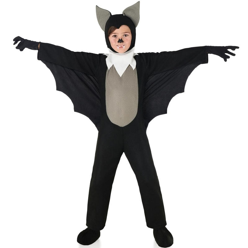 Le costume Halloween Chauve-souris des ténèbres pour garçons contient: combinaison avec des ailes, une capuche, des gants et des couvre-chaussures | Cette tenue terrifiante garçon imitant un chauve-souris noire et grise est disponible en 4 tailles différentes