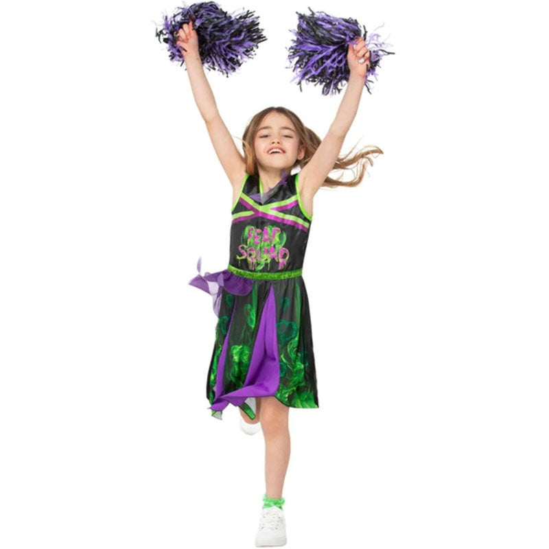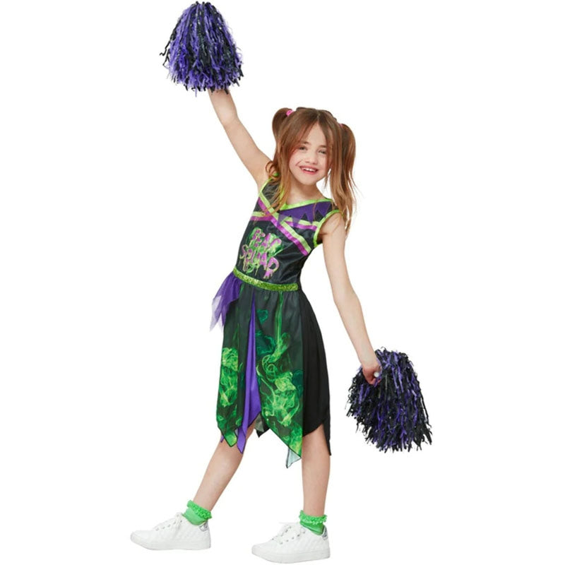Le costume Halloween cheerleader toxique pour filles contient: robe et pompons | Cette tenue effrayante fille imitant une cheerleader zombie est disponible en 3 tailles différentes