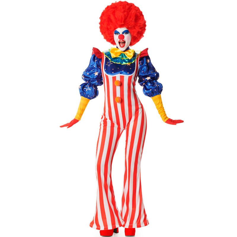 Le costume original de Clown américaine pour femmes contient : chemise, manchettes, combinaison et col avec nœud papillon | Cette tenue femme imitant clown américaine est disponible en 4 tailles différentes