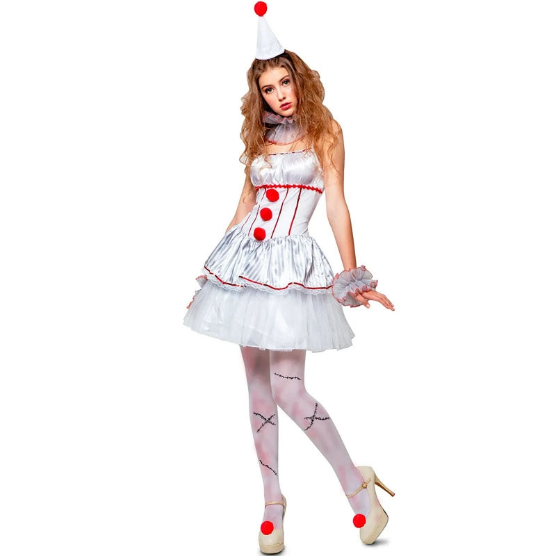 Le costume Halloween Clown mystique pour femmes contient : robe, manchettes, tour de cou et coiffe | Cette tenue sinistre femme imitant une clown tueur sexy est disponible en 3 tailles différentes