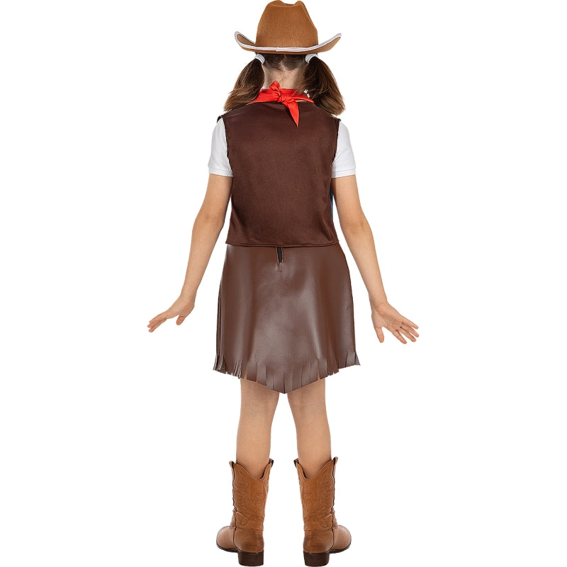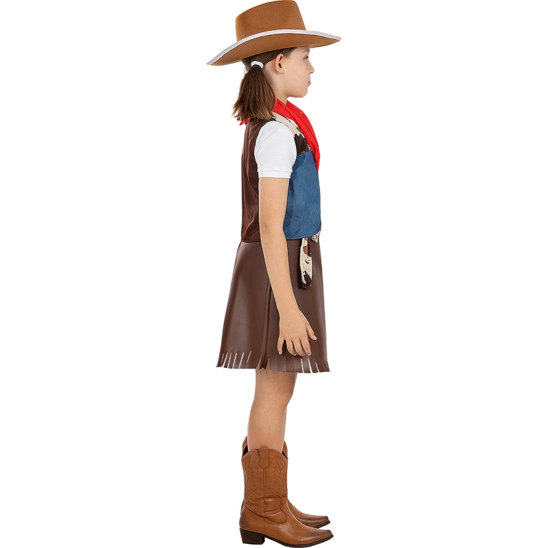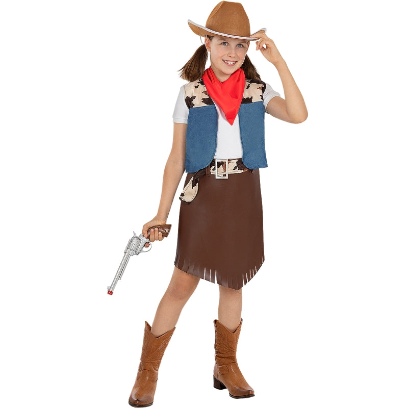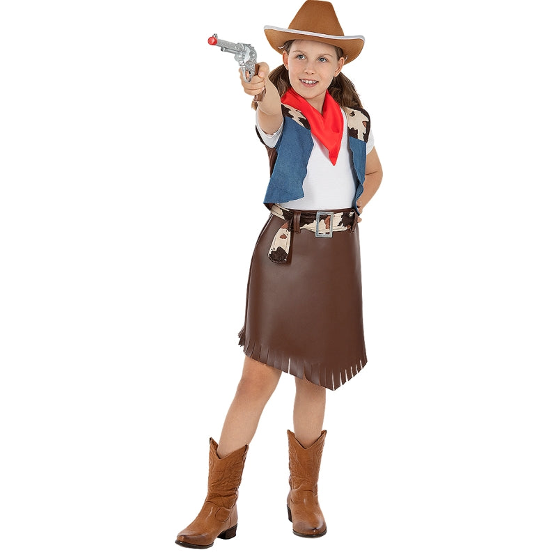 Le costume original Cowgirl pour filles comprenant : Jupe, gilet, ceinture et foulard | Cette tenue fille imitant une Cow-girl du Far West est disponible en 4 tailles différentes