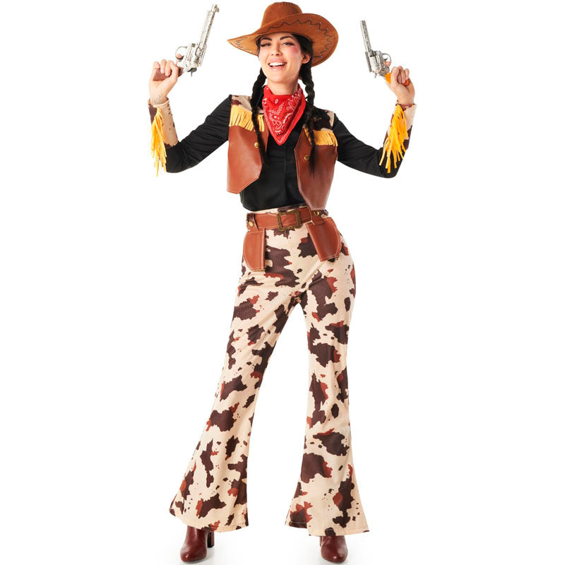 Le costume original de Cowgirl du ranch robuste pour femmes contient : gilet, pantalon, ceinture avec cartouchières, poignets et foulard | Cette tenue femme imitant cowgirl rude de l’Ouest est disponible en 4 tailles différentes