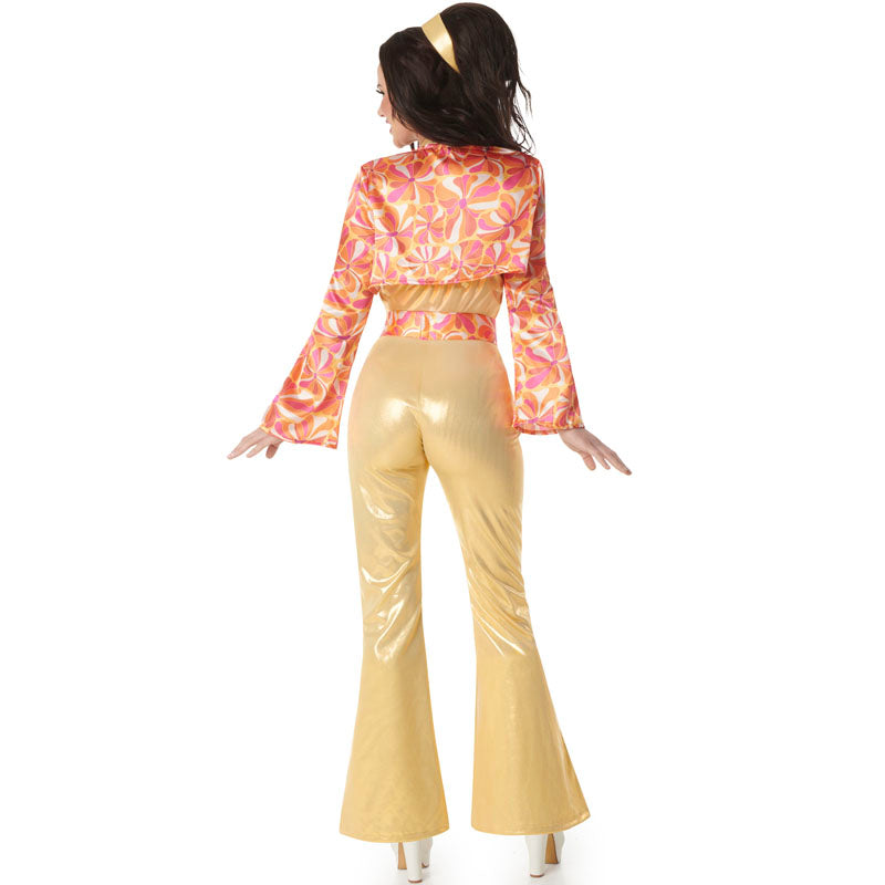 Le costume original de Disco doré années 70 pour femmes contient : diadème, veste, combinaison et ceinture | Cette tenue femme imitant style seventies doré est disponible en 4 tailles différentes