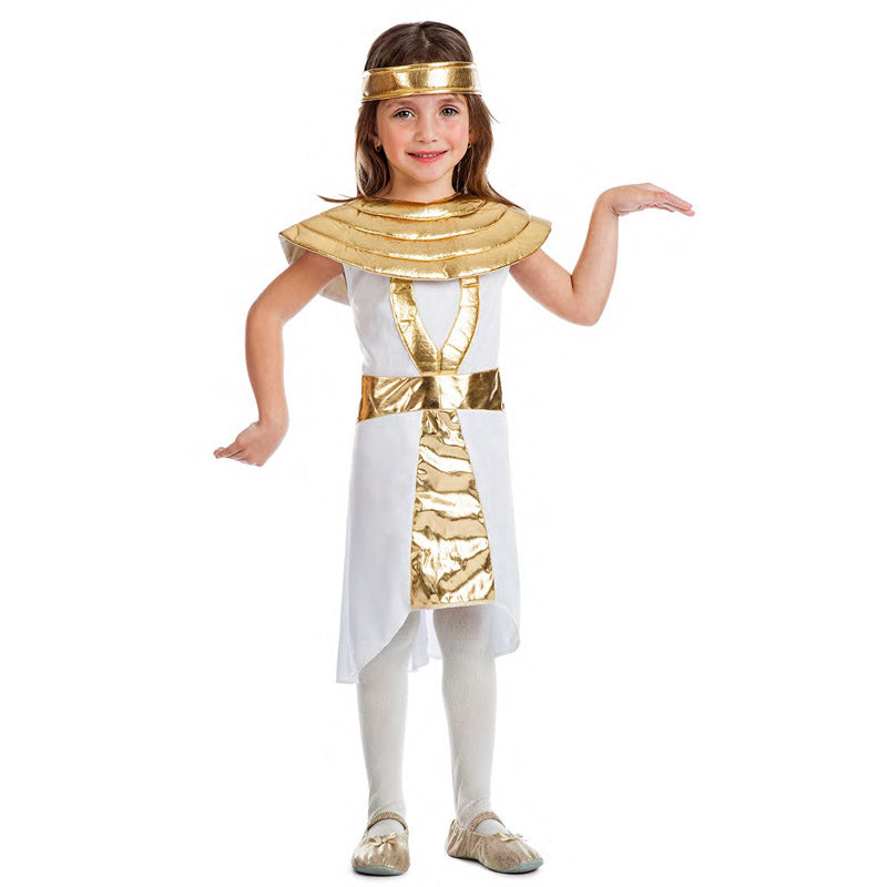 Le déguisement enfant Pharaonne égyptienne en couleur or pour filles contient: Robe et bandeau pour la tête. Ce déguisement pas cher égyptienne fille est disponible en 4 tailles différentes.