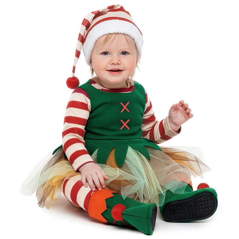 Le costume de Noël Elfe Féminine Deluxe pour bébés comprend: Bonnet, t-shirt, pantalon, couvre-bottes | Ce déguisement de bébé Lutine de Noël est disponible en 3 tailles et est parfait pour Noël