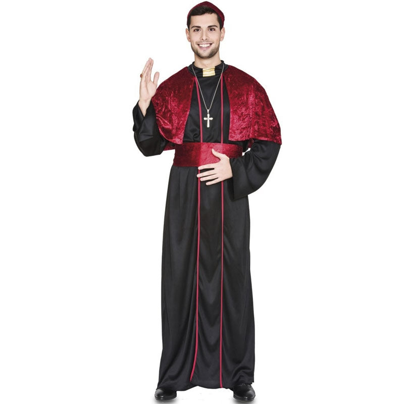 Le costume original imitant l’uniforme d’un évêque de couleur noir pour homme comprend : tunique, ceinture et coiffe | Cette tenue noire d’évêque pour adulte est disponible en taille unique