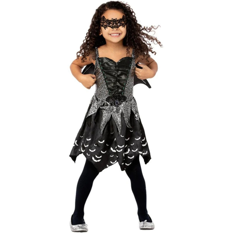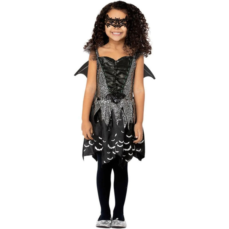Le costume Halloween Fée chauve-souris pour filles contient: robe, ailes et masque | Cette tenue effrayante fille imitant une fée des ténèbres est disponible en 3 tailles différentes