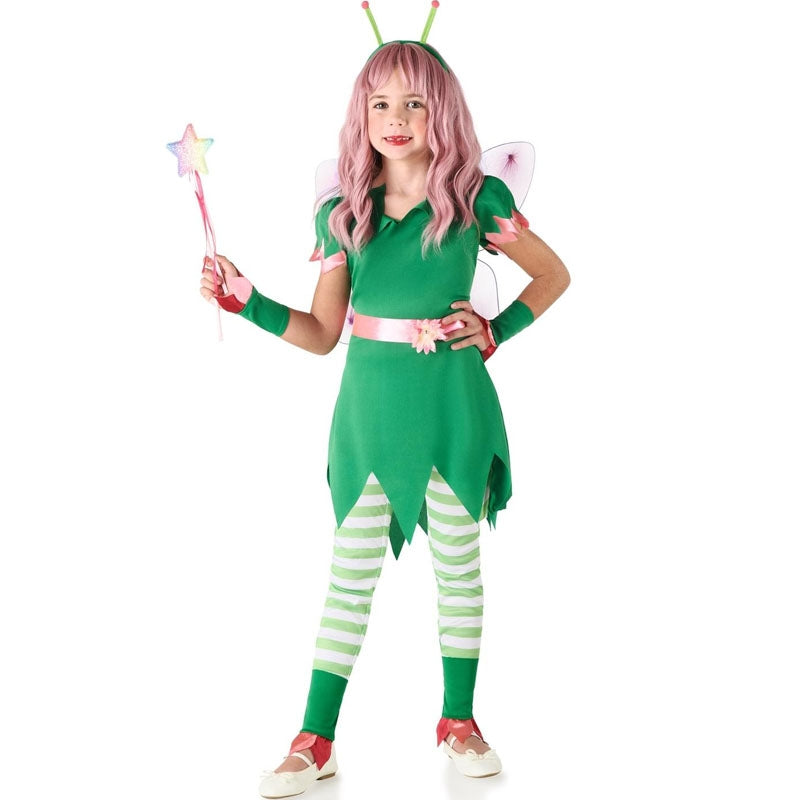 Le costume original Fée Clochette verte pour filles comprenant : Robe, bandeau, ailes, brassards, jambes et jambières | Cette tenue fille imitant une Fée Clochette avec des ailes vertes est disponible en 4 tailles différentes