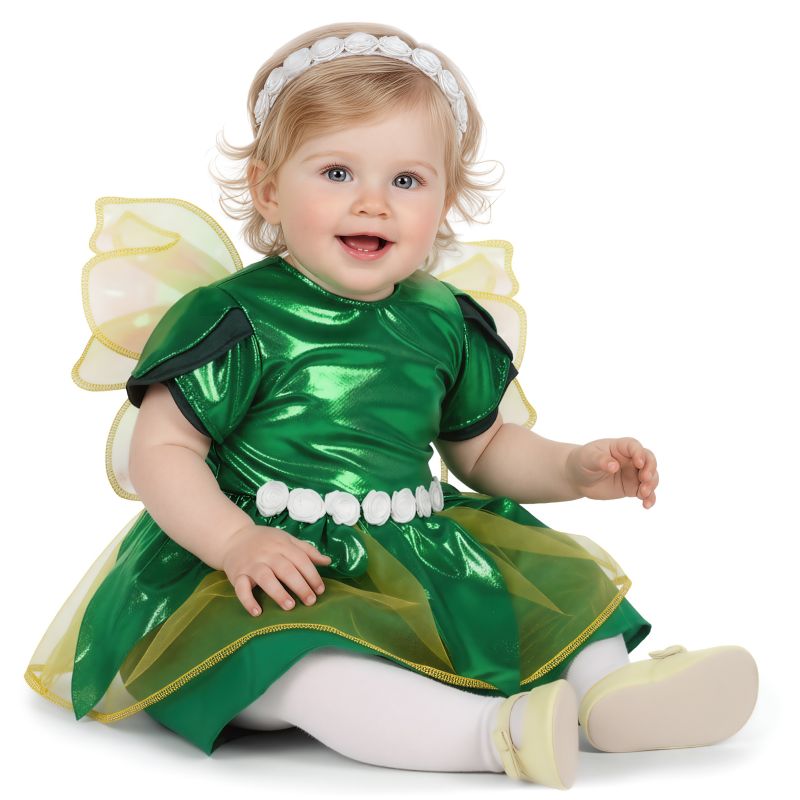 Le costume original Fée de la Forêt pour bébés contient : Bandeau, robe, ailes | Cette tenue bébé imitant Fée Clochette est disponible en 3 tailles différentes