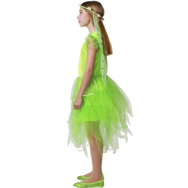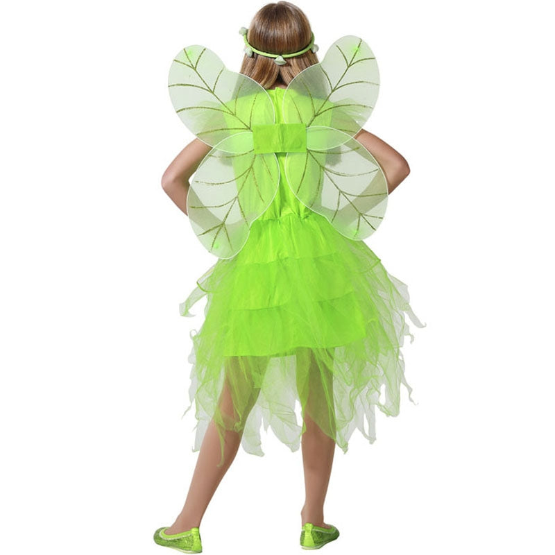 Le déguisement Fée Verte pour fille contient: Robe, Ailes et Coiffe.