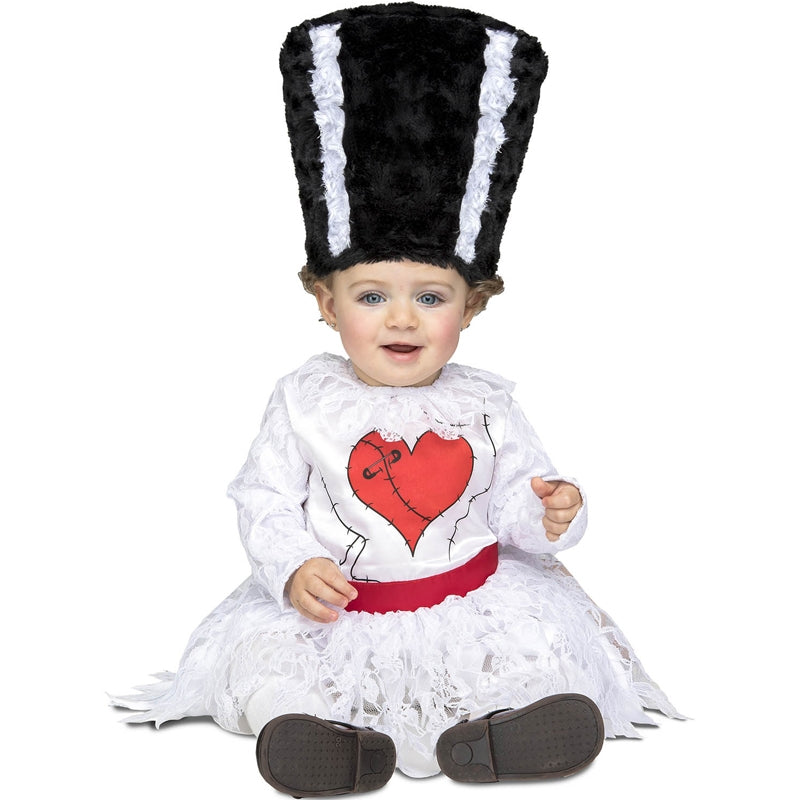 Le costume Halloween enfant imitant la Fiancée Frankenstein pour bébés contient: robe et coiffe | Ce déguisement Fiancée Frankenstein bébé est disponible en taille unique