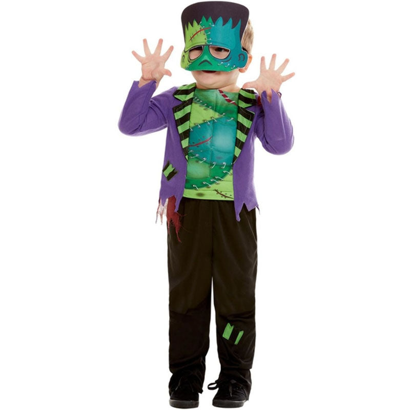 Le costume Halloween Frankenstein vert pour bébés contient : chemise, pantalon et masque | Cette tenue bébé horrifiante imitant un Monstre Frankenstein est disponible en 2 tailles différentes