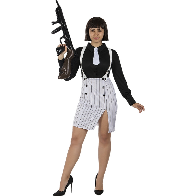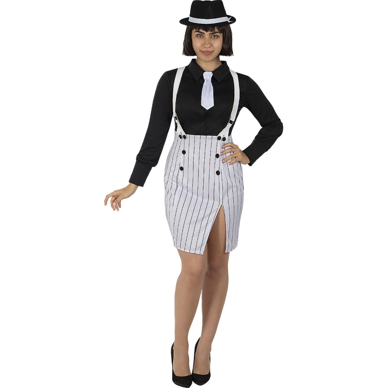 Ce costume exclusif de Gangster Blanc pour femmes contient : Robe, cravate et bretelles | Ce déguisement de femme pour se transformer en mafieuse des années 20 avec style impeccable est disponible en 5 tailles différentes