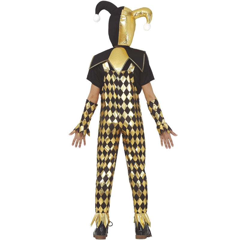 El disfraz Halloween infantil imitando a Arlequín dorado para niñas incluye: camiseta, peto, mangas, diadema y cuello | Este traje niña Arlequín dorado está disponible en 4 tallas distintas