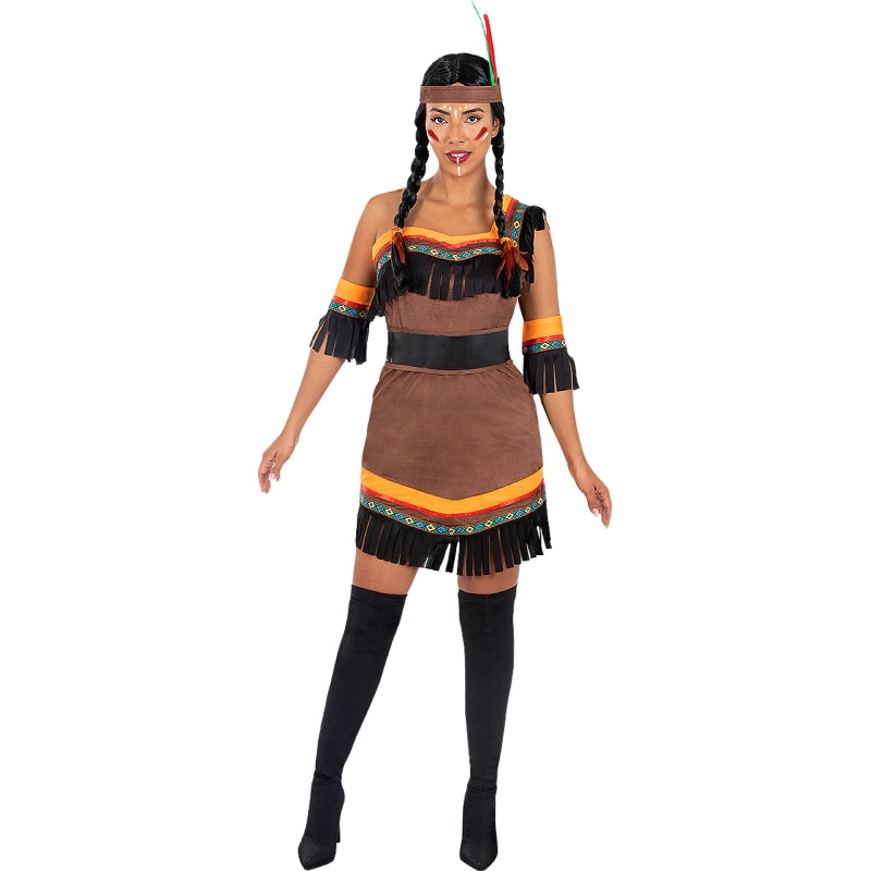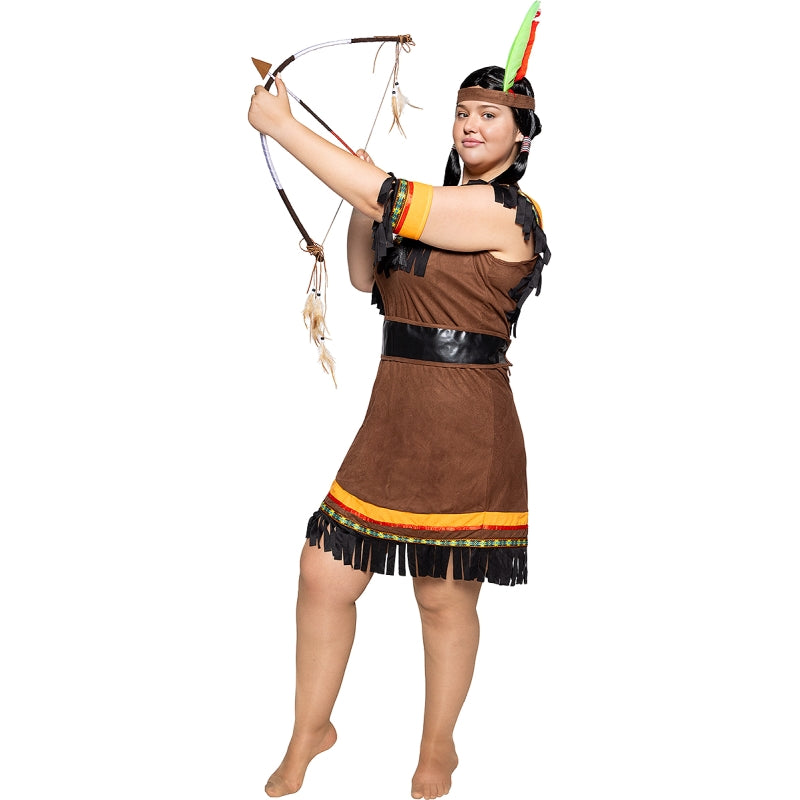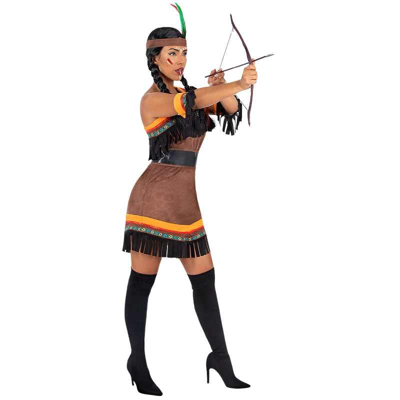 Ce costume exclusif de Indienne Sexy Deluxe pour femmes contient : Robe, ceinture, bracelets et bandeau avec plume | Ce déguisement de femme pour se transformer en native légendaire au style sophistiqué est disponible en 5 tailles différentes