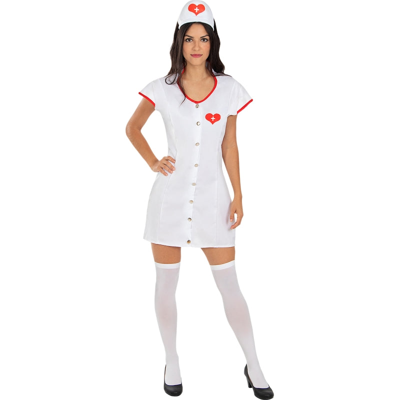 Ce costume exclusif de Infirmière Sexy Cœur pour femmes contient : Robe avec serre-tête | Ce déguisement de femme pour se transformer en infirmière provocante avec détails romantiques est disponible en 3 tailles différentes