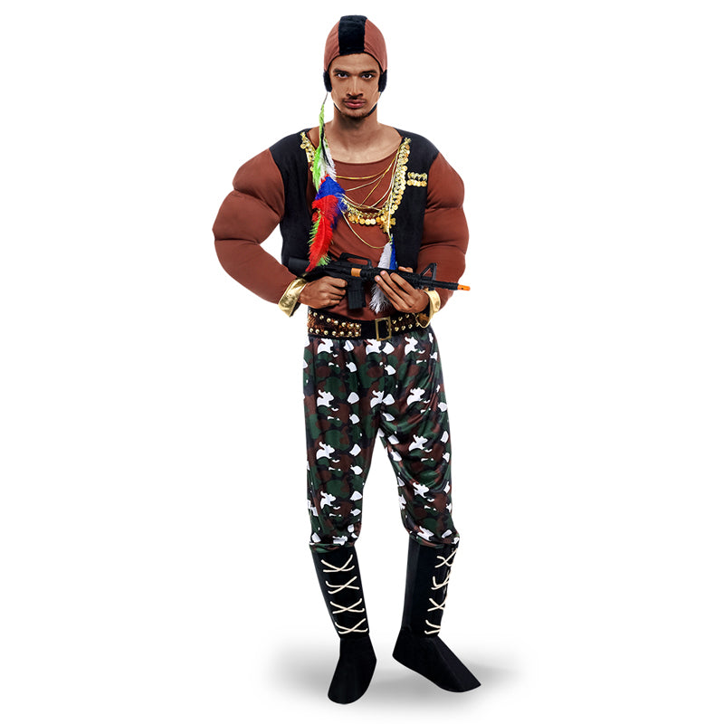 Le costume pour homme imitant le personnage du A Team, M.A Barracus contient: Chemise rembourrée, colliers, pantalon, surbottes, coiffe et ceinture.