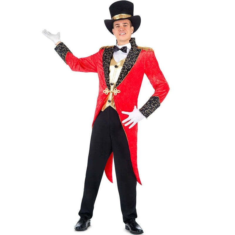 Le costume original Maître de piste de cirque pour hommes contient : veste avec gilet, pantalon, chapeau et nœud papillon | Cette tenue adulte imitant un Monsieur loyale est disponible en 3 tailles différentes