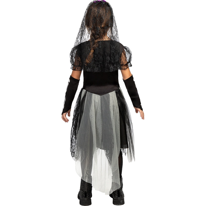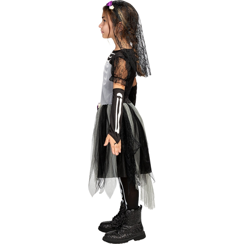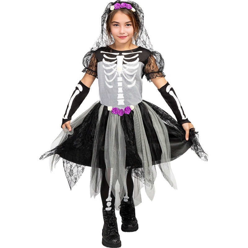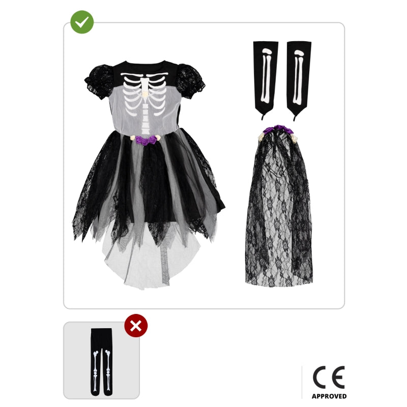 Le costume original Mariée Squelette avec Dentelle pour filles comprenant : Robe, manchons et serre-tête | Cette tenue fille imitant une Mariée squelette avec dentelle blanche est disponible en 4 tailles différentes