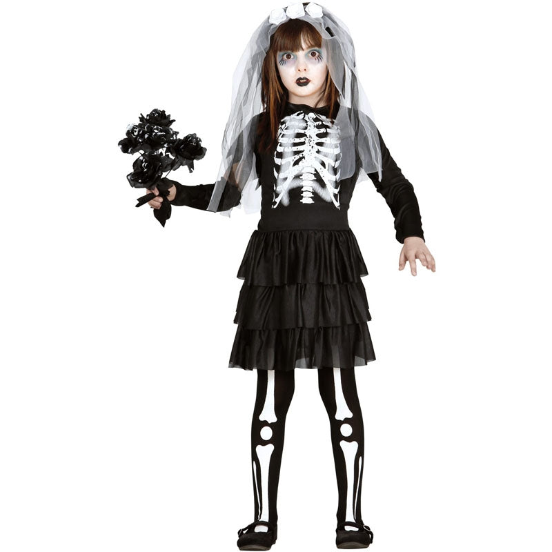 Le costume Halloween Mariée squelette zombie pour filles comprenant : voile, manche, robe et collants | Cette tenue effrayante fille imitant une Squelette ténébreuse est disponible en 3 tailles différentes