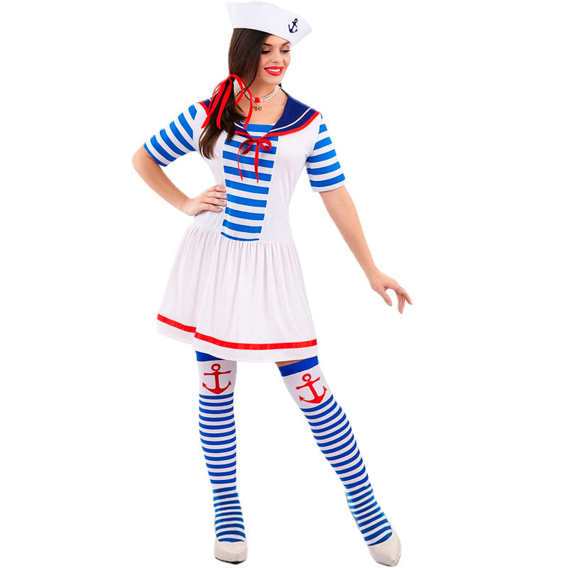 Le déguisement adulte imitant une marin avec ancre pour femmes contient: Robe et coiffe | Ce déguisement marin femme est disponible en taille unique