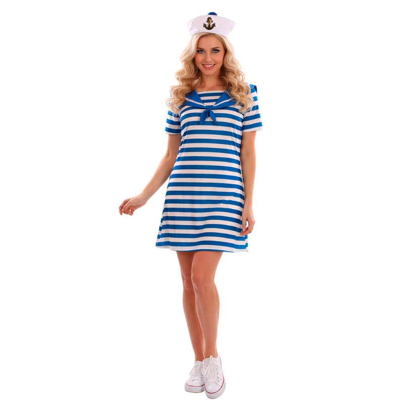 Le costume original de Marinière Haute Mer pour femmes contient : Robe, casquette | Cette tenue femme imitant Marinière à Rayures est disponible en 3 tailles différentes