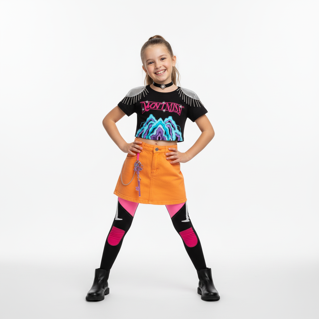 Le costume original Mira de K-Pop pour filles comprenant : Top, jupe et leggings | Cette tenue fille imitant une Mira la guerrière Kpop des Demon Hunters est disponible en 4 tailles différentes
