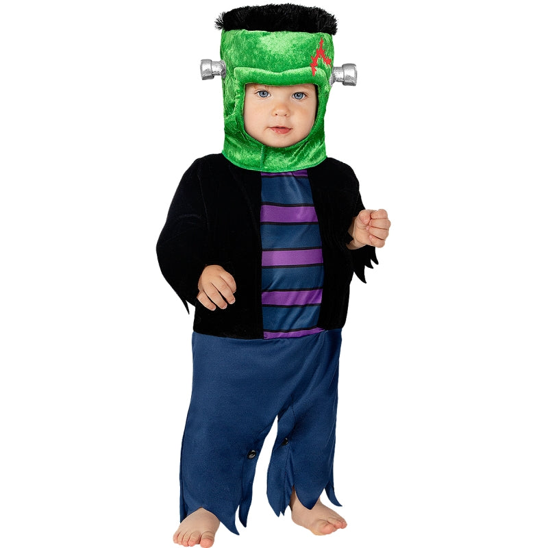 Le costume terrifiant pour bébés de Monstre Frankenstein comprend : Combinaison et accessoire de tête | Cette tenue de bébé exclusive, imitant un Monstre électrique, est disponible dans 3 tailles différentes.