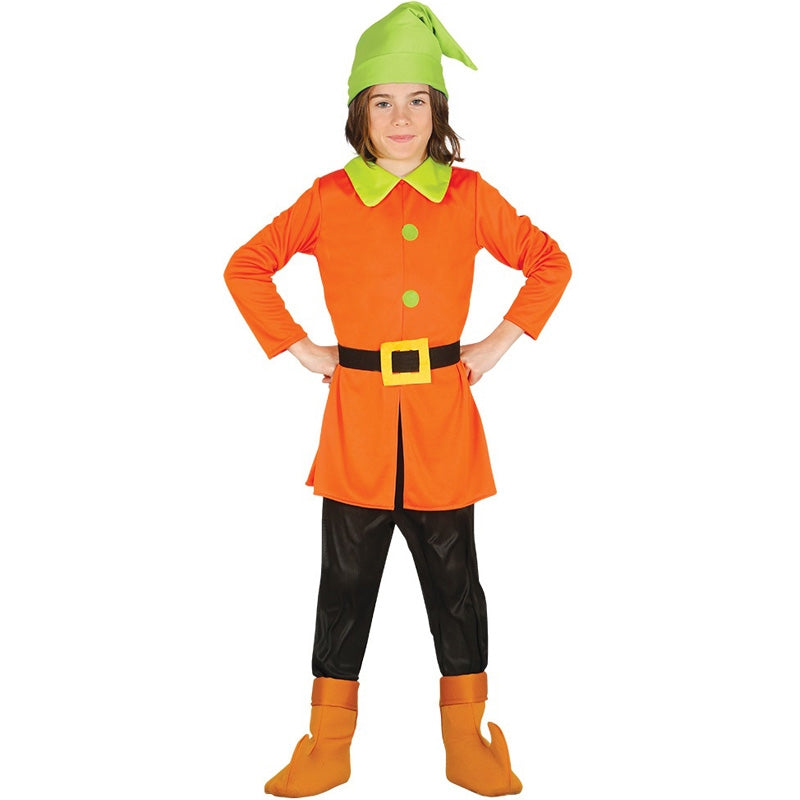 Le costume enfant imitant un nain du conte Blanche neige pour garçons contient: coiffe, chemise, ceinture, pantalon et surbottes | Ce déguisement nain blanche neige est disponible en 3 tailles différentes