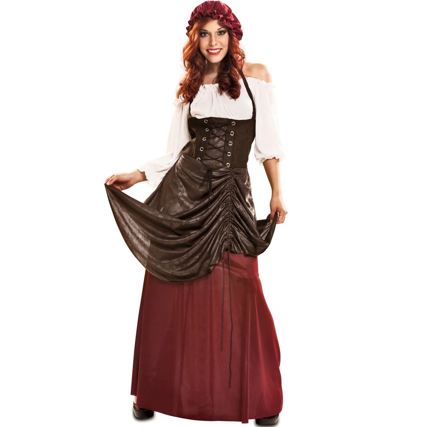 Le déguisement Patronne de bistrot pour femme contient: Robe avec gilet et coiffe.